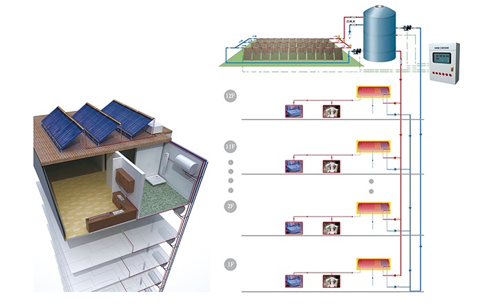 集熱系統(tǒng)集中放置在屋面等適合安裝的位置,分戶儲(chǔ)熱水箱可在室內(nèi)靈活放置;